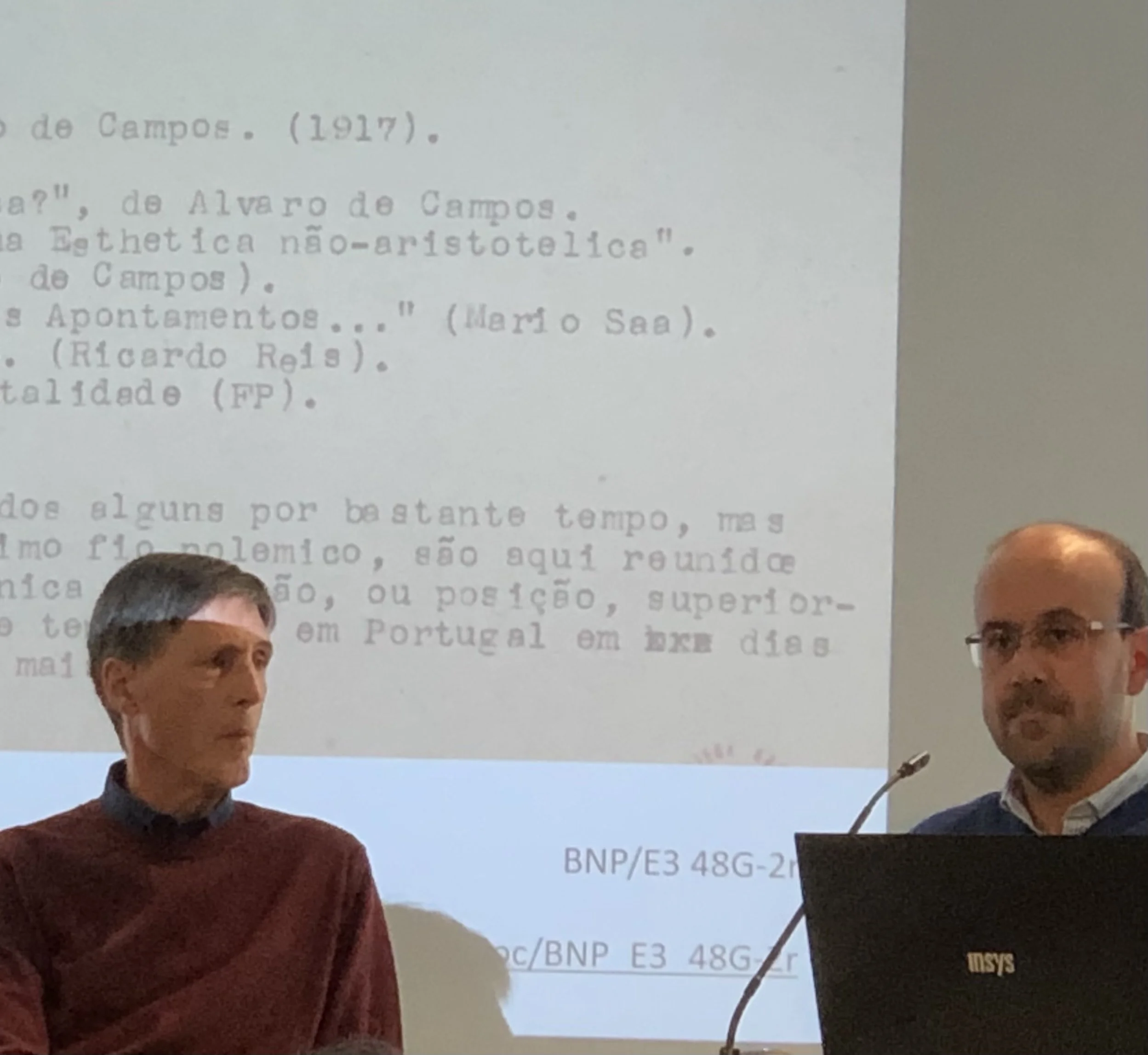 Pessoa scholar Nuno Ribiero (right) presents his work at the Athena 100 Colloquium at the Casa Fernando Pessoa, alongside fellow scholar Fernando Cabral Martins (left).